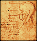 Beim Malen eines Menschen beachtete Leonardo jedes Detail, alle einzelne Muskeln. Er musste den menschlichen Körper also genau kennen. Naturforschung war für ihn also eine Vorbedingung für's Malen. Er untersuchte aber nicht nur den Aufbau des menschlichen Körpers, sondern studierte auch den Vogelflug und andere Naturphänomene. Er hinterliess nach seinem Tod über 5000 Seiten Zeichnungen und Notizen, aus Natur, Technik und Malerei. Er schrieb seine Notizen seitenverkehrt in einer "Geheimschrift", die er sich selber beigebracht hatte.Warum verschleierte er seine Schriften?Möglicherweise wollte er sich vor der Kirche schützen. Wir dürfen nicht vergessen, dass die Kirche auchin der Renaissance, der zeit des Lernens, noch immer sehr mächtig war.