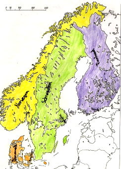 Im Westen liegen vor der norwegischen Küste viele kleine Inseln, an welchen sich die Wellen des grossen Atlantiks brechen. Dahinter liegen grosse Felsen und die Tausend Meter tiefen Fjorde. Das Wasser der grossen Wasserfällen stürzen in die Fjorde. Nach diesen grossen Labyrinth Fjorde kommt ein Hochland mit einzelnen Tieren.Danach kommt das grosse schwedische Waldgebiet. Dort werden Bäume gefällt und in den Fluss geworfen. Sie werden von den Fabriken aufgefangen. Im Osten hat es Kornfelder weil es weniger regnet.