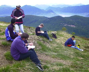 Dann führte uns das Postauto (Kurven Kurven, Kurven) nach Miglieglia und dann die Seilbahn hinauf auf den Monte Lema. Ein kalter Nordwind blies uns entgegen und hinderte uns ein wenig, die tolle Aussicht so richtig zu geniessen. So begannen wir rasch den Abstieg. |
