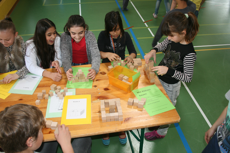 In den letzten 6 Wochen hat Antonia Möhl sich jeden Dienstag um 11.00 Uhr mit ihren Schützlingen getroffen und gemeinsam mit ihnen die Ausstellung vorbereitet. Gezeigt wurde eine Diaschau mit Bildern der Baustelle, Pläne, Bodenbeläge und Wandfarben. Es wurden aber auch die verschiedenen Berufe auf einer Baustelle vorgestellt und über allerlei Baumaschinen informiert. Ausserdem konnten die Kinder selber mit Klötzen und Papierelementen Häuser und Türme bauen. Für Abwechslung und Auflockerung sorgten die 3. Klassen von Katharina Bollinger und Monika Fosco mit der Aufführung ihres Baustellen-Raps.