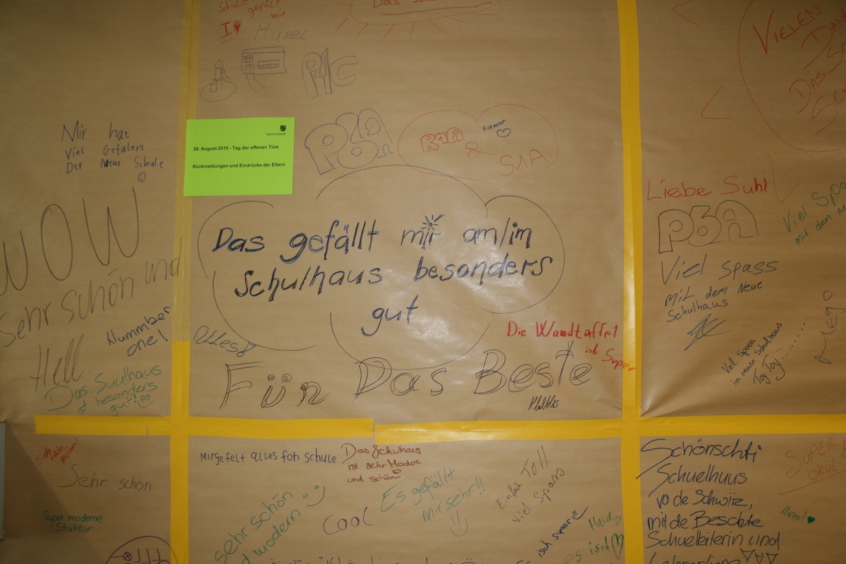 Beim Rundgang der geladenen Gäste und der Angehörigen der Lehrpersonen am Nachmittag waren wiederum durchwegs positive und begeisterte Worte zu vernehmen. Mach einer wünschte sich mit einem Schmunzeln zurück auf die Schulbank. Bei Kaffee und Kuchen und mit angeregten Gesprächen liess man den Nachmittag im neuen, gemütlichen Lehrerzimmer ausklingen.