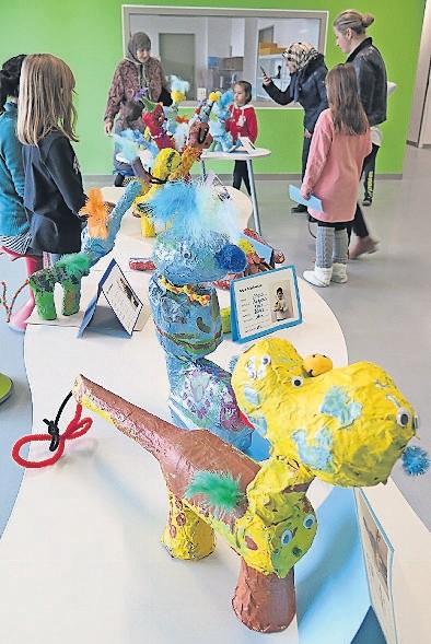 | Emsiges Treiben in den Gängen des Schulhauses Hasel während der Stunde, in der die Schüler ihre Arbeiten präsentieren. | Fabelwesen, gekleistert | |
