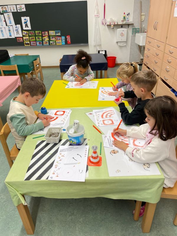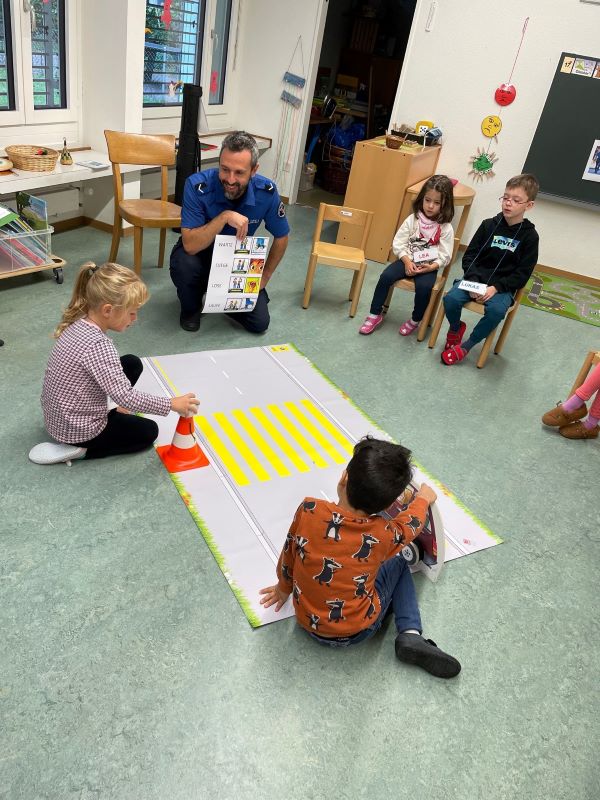 Begleitet wurde Pilonis von Herrn Baumann von der Regionalpolizei Wettingen-Limmattal. Nach verschiedenen Spielen rund um die Verkehrssicherheit ging ein Teil der Klasse mit Herrn Baumann auf die Strasse, um das Gelernte in der Praxis zu üben. Der andere Teil der Klasse durfte inzwischen einen Pilonis basteln. Dann wurden die Gruppen getauscht, sodass alle Kinder an diesem Morgen dem Polizisten zeigen konnten, dass sie sich im Strassenverkehr sicher bewegen können.