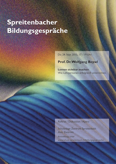 5. Spreitenbacher Bildungsgespräch Donnerstag, 24. September 2015, 17:00 Uhr bis 19:00 Uhr, Aula Zentrum, Spreitenbach Lernen sichtbar machenWie Lehrpersonen erfolgreich unterrichten Prof. Dr. Wolfgang Beywl |