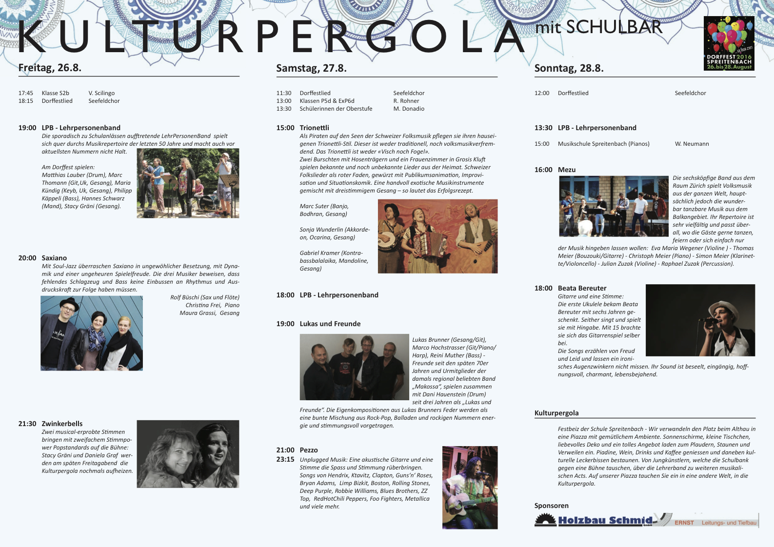 Für die Jüngsten zeigten die beiden Schauspielerinnen und der Schauspieler das Theater vom kleinen Mädchen Sofie, das seine Mutter gegen eine neue Mama eintauscht. Bald merkt das Kind, dass das nicht nur toll ist, auch wenn man alles bekommt, was man sich wünscht. Der bekannte Beatboxer Nino G. riss die älteren Schülerinnen und Schüler der Oberstufe mit seinen Beats am nächsten Tag mit, währenddem die Schauspieler Clo Bisaz und Thomy Truttmann mit „Nik & Schmutz“ ein Stück für die 4. und 5. Klassen spielten und das Vorstadttheater Basel mit seiner Produktion «Grosser Bruder» die 6. und 7. Klassen begeisterte.