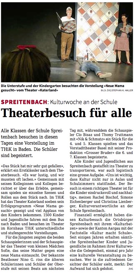 Seit einigen Jahren erhalten sämtliche Spreitenbacher Kinder und Jugendliche im Rahmen ihrer Kulturwoche die Gelegenheit, einmal pro Jahr eine kulturelle Veranstaltung zu besuchen. Wer in die zufriedenen Gesichter der Schülerinnen und Schüler sieht, merkt: der Aufwand hat sich gelohnt.