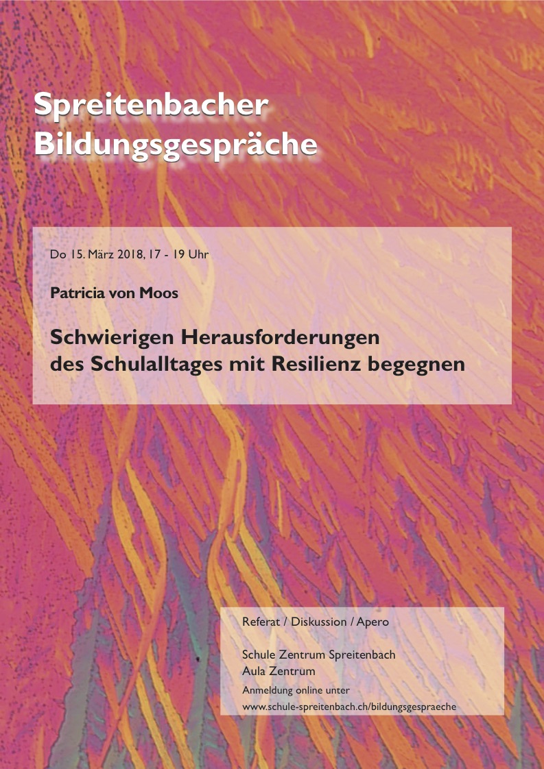 Donnerstag, 15. März 2018, 17:00 Uhr bis 19:00 Uhr, Aula Zentrum, Spreitenbach Schwierigen Herausforderungen des Schulalltages mit Resilienz begegnenPatricia von Moos |