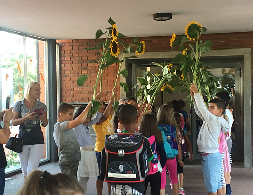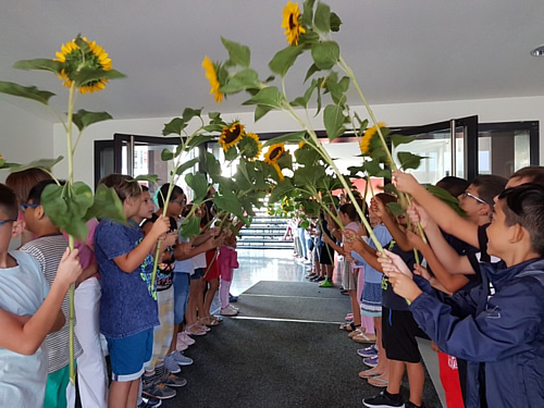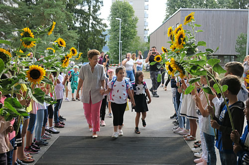 Die Schülerinnen und Schüler aus der 2. bzw. 3. Klasse standen in den Schulhäusern traditionell mit Sonnenblumen Spalier für die neuen Erstklässlerinnen und Erstklässler. In den nächsten Tagen werden die Grossen den Kleinen ihr Schulhaus zeigen.