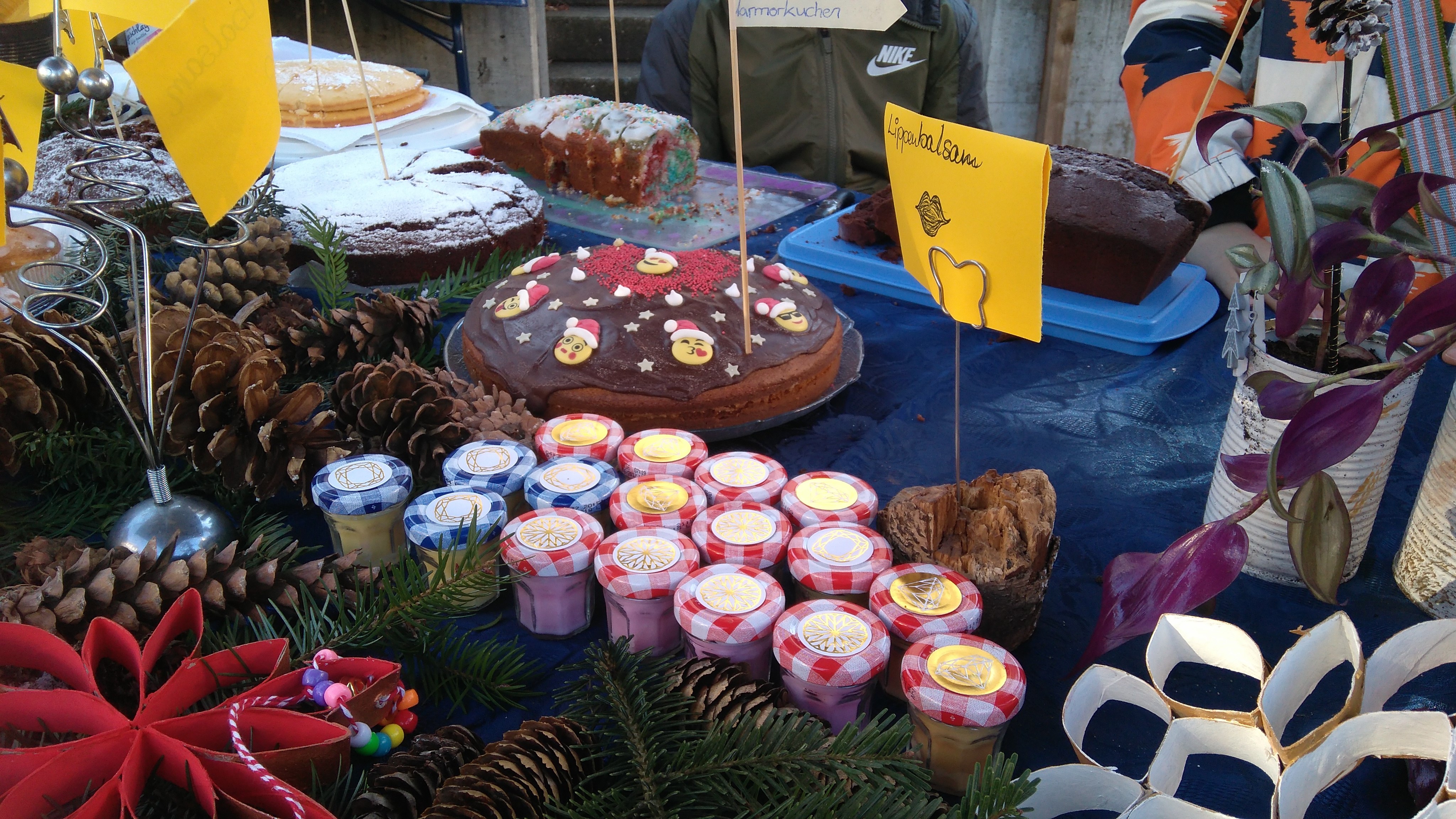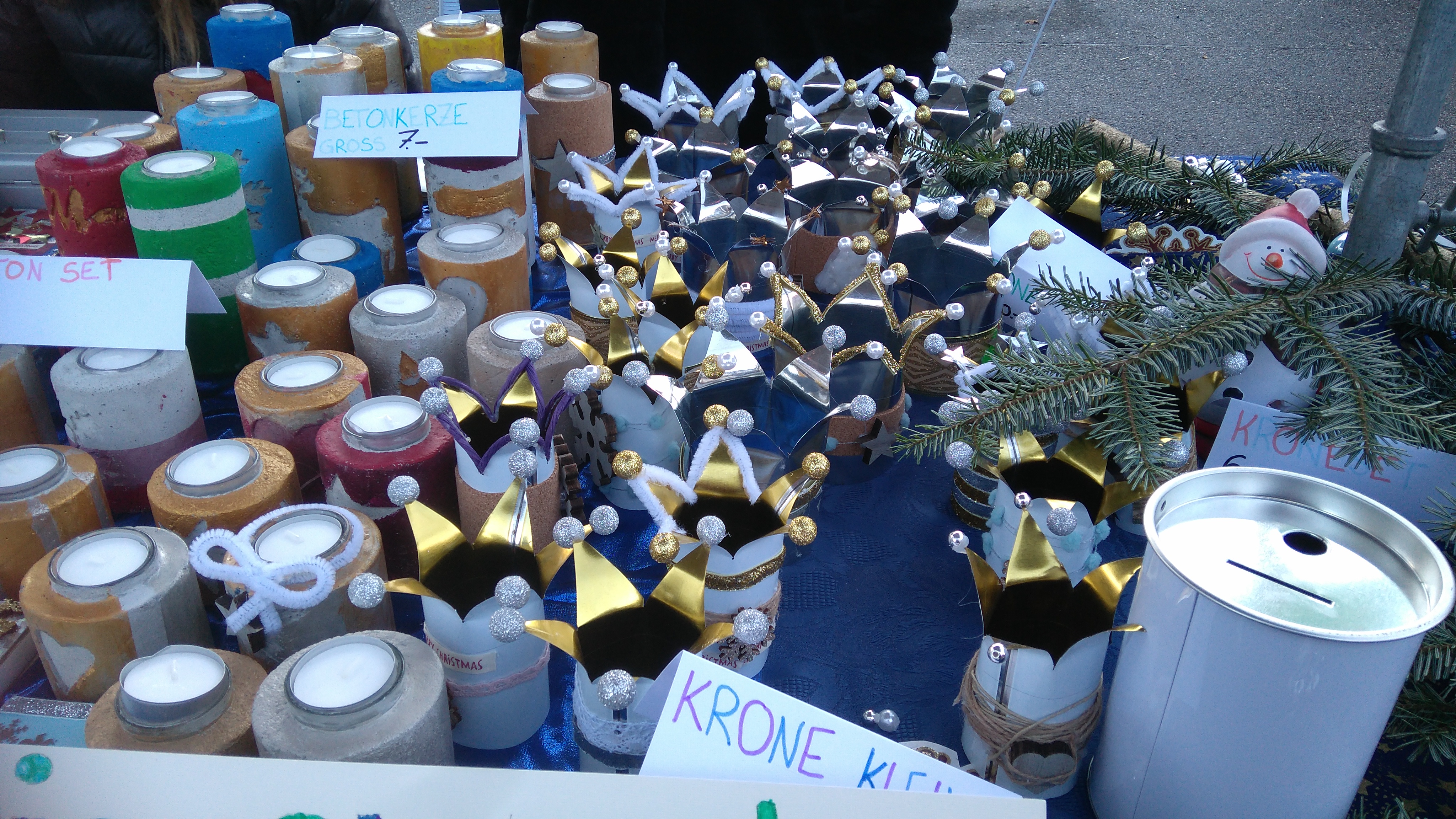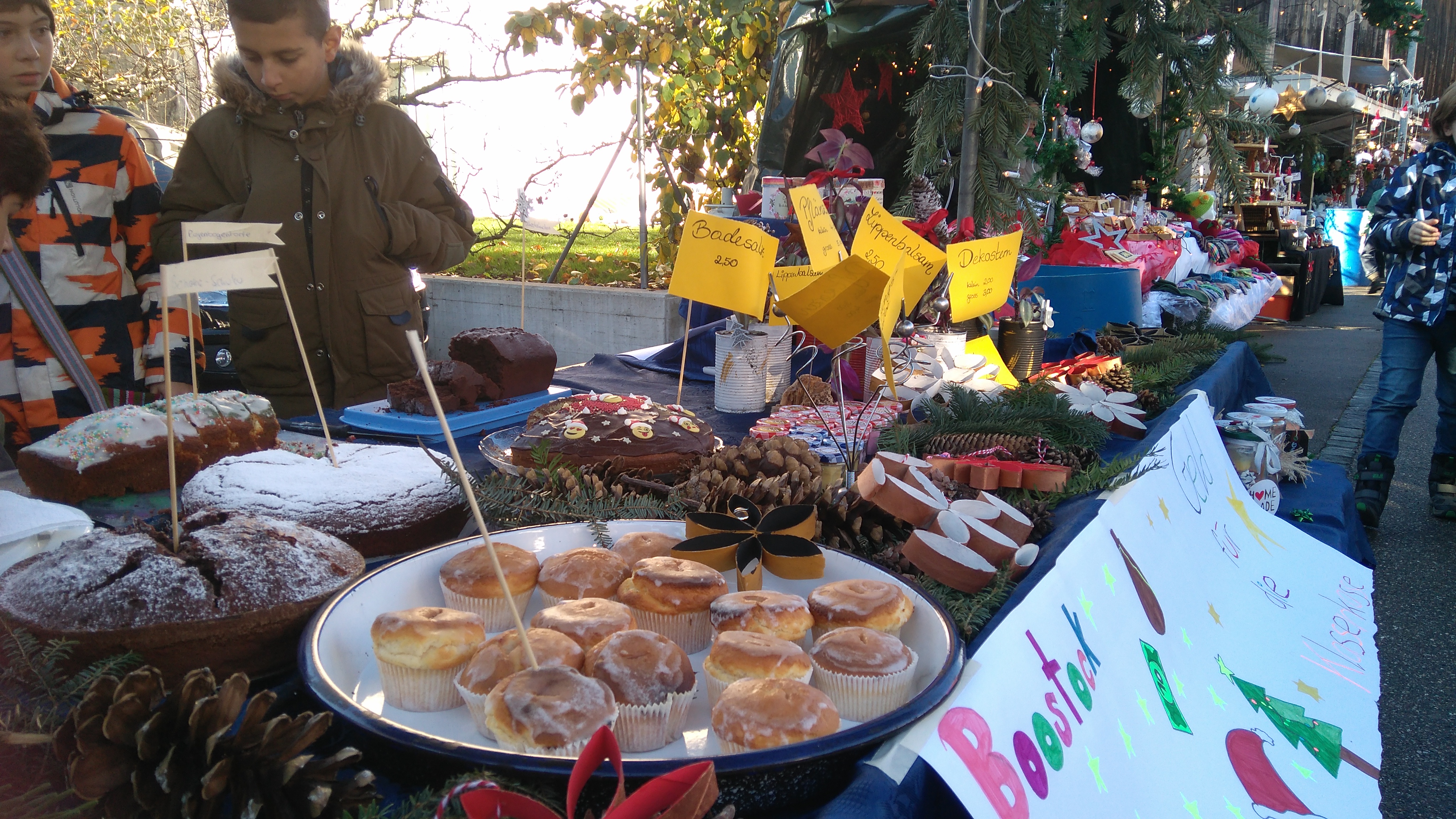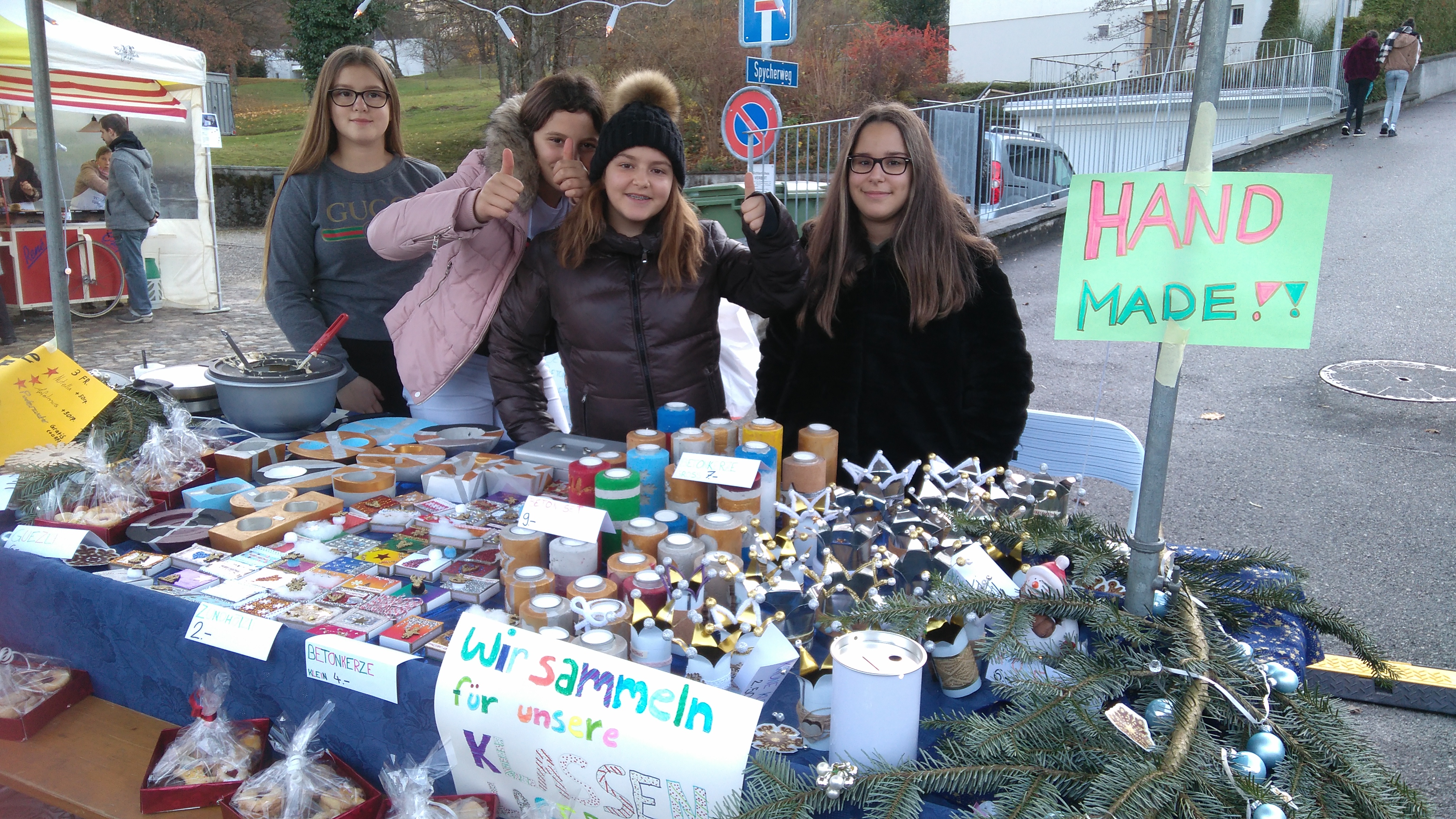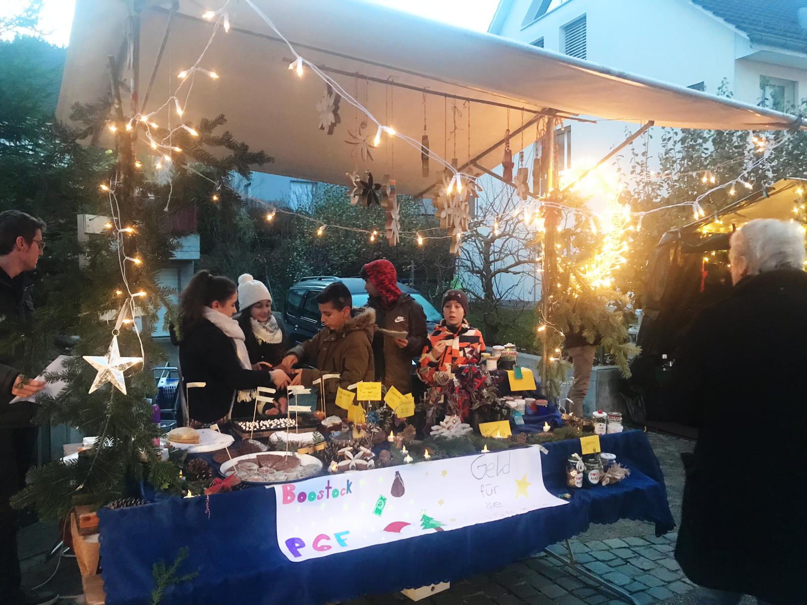 Dass 11-12jährige so viel Verantwortung übernehmen, ist zwar keine aussergewöhnliche Sache, aber trotzdem nicht alltäglich. Die Idee, mit selbstgebastelten Kerzenlichtern, Pflegecremes, Kuchen und Waffeln (nur eine kleine Auswahl der angebotenen Preziosen!) auf dem Weihnachtsmarkt Geld zu verdienen, entstand eigentlich schon früh im Schuljahr. Wie viel Arbeit das aber wirklich bedeutet, waren sich die Sechstklässler des Boostock-Schulhauses aber wohl auch nicht ganz bewusst. Gelernt haben sie es nun jedenfalls in den Wochen der Produktion und beim lächelnden Stehen in der (zum Glück noch gut erträglichen) Kälte am Stand: Geld wächst eben doch nicht auf Bäumen, man muss es sich verdienen.